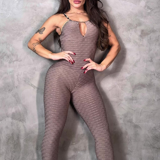 Elevate your workout style with this bold Scrunch Booty Brown Jumpsuit. Crafted from 90% polyamide and 10% spandex, this piece delivers exceptional durability, breathability, and elasticity for maximum comfort during training, running, yoga, dancing, and all sports activities. The scrunch booty silhouette provides a flattering fit with excellent waist grip, while the high-quality fabric resists wrinkles and offers complete coverage with zero transparency. Perfect for those who demand both performance and fashion-forward flair. Available in Small (2-4), Medium (6-8), and Large (10-12). **Please note: This item is final sale with no returns accepted.**